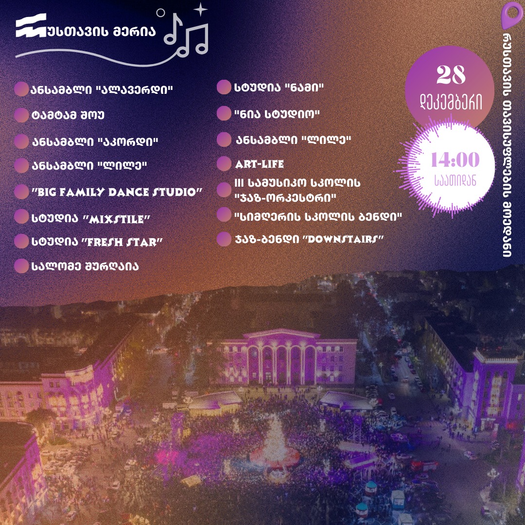 კონცერტში მონაწილეობენ: * ანსამბლი ,,ალავერდი” * ტამტამ შოუ * ანსამბლი ,,აკორდი” *”BIG FAMILY DANCE STUDIO” * ”MIXSTILE” * ”FRESH STAR” * სალომე შურღაია * სტუდია ,,ნამი” * ,,ნია სტუდიო” * ანსამბლი ,,ლილე” * ART-LIFE * მე-3 სამუსიკო სკოლის ,,ჯაზ – ორკესტრი” * ,,სიმღერის სკოლის ბენდი” * ჯაზ-ბენდი “DOWNSTAIRS”