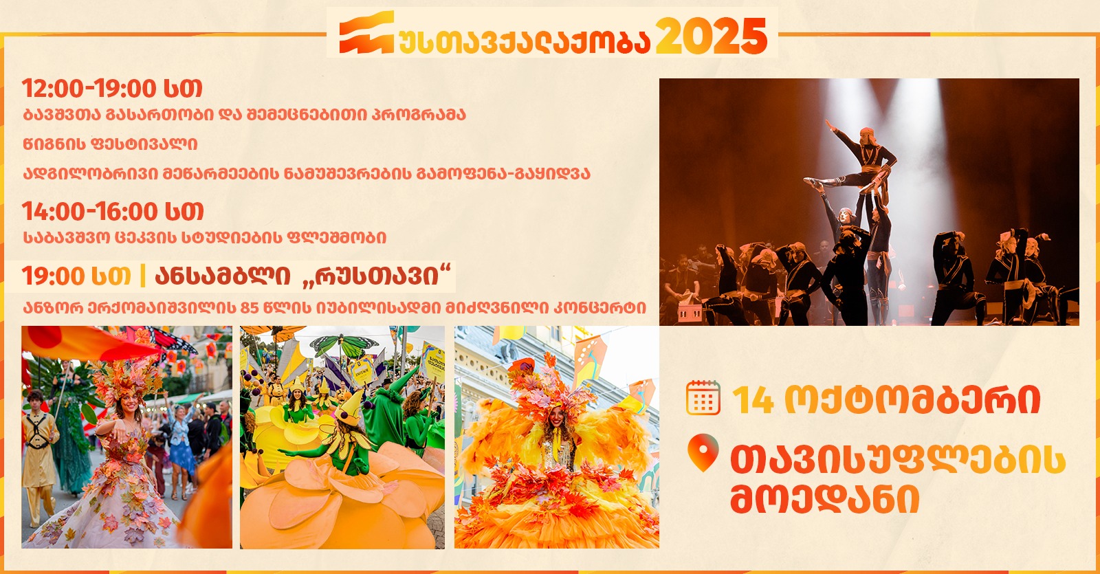 ქალაქის დღესასწაული, რუსთავის თავისუფლების მოედანზე, 12:00 საათზე მრავალფეროვანი საბავშვო პროგრამით დაიწყება.